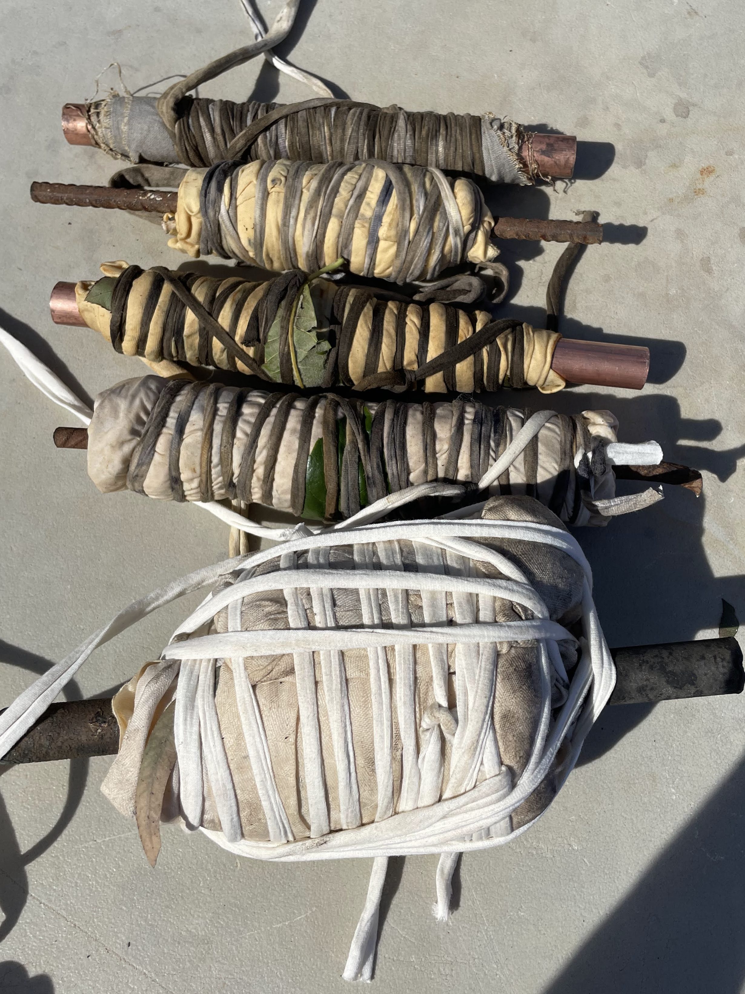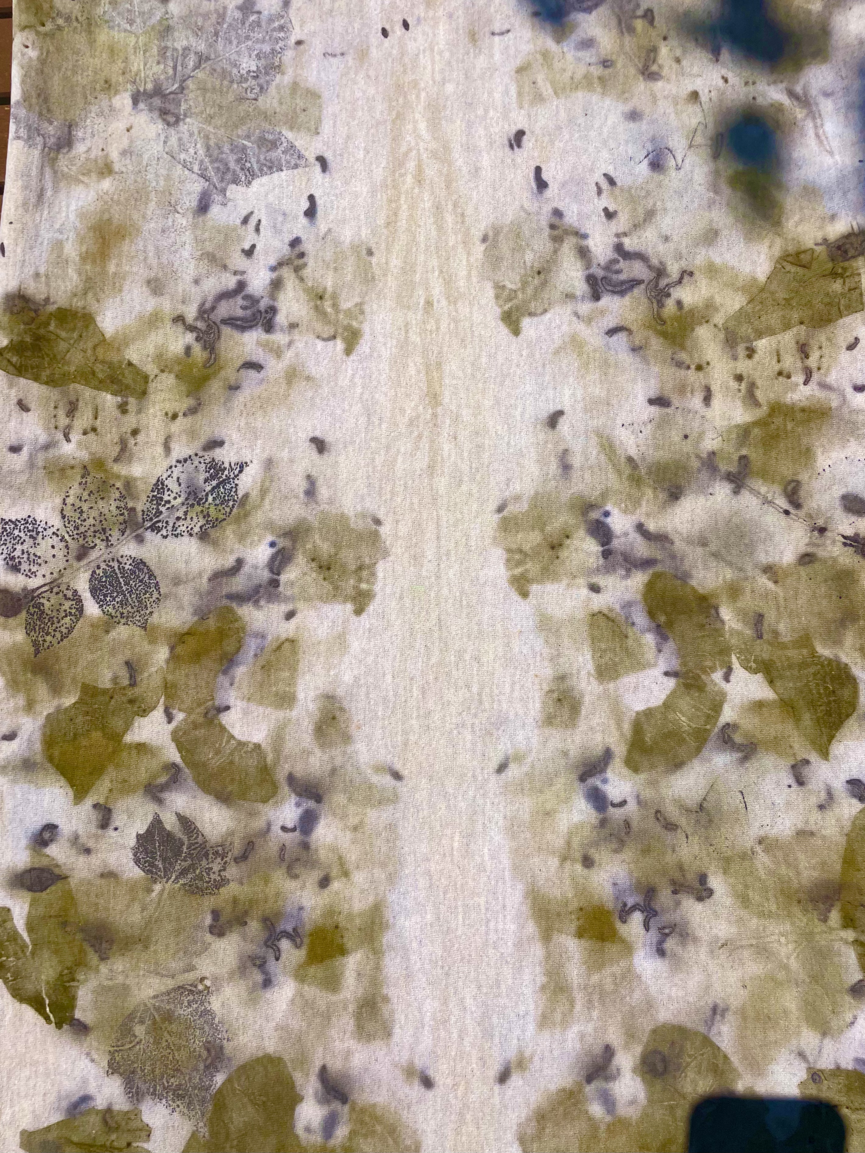 This is why I have found myself falling in love with the “dirty pot” method of botanical printing and dyeing. Even when I try to create a specific design leaves and bark shift as I roll them around the copper or iron pipes or concertina the leaves into a press. It doesn’t matter since every reveal is a wonderful surprise of pattern and unexpected color.